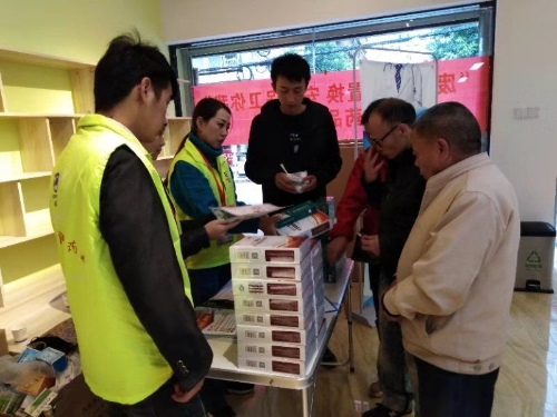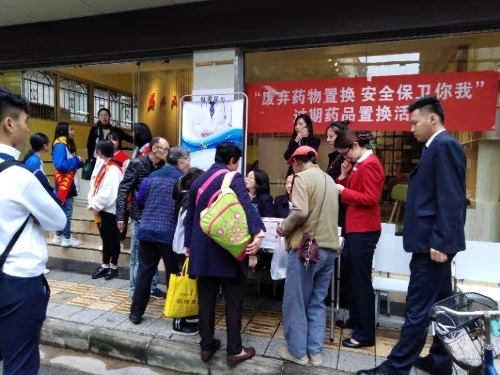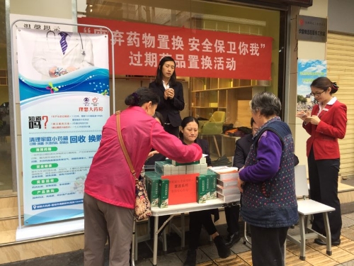 活动前,三合营社区就已通过云岭先锋短信平台、微信公众、居民交流群、小区张贴通知等形式发出回收过期闲置药品的通知,号召小区居民将家中过期闲置的药品集中到三合营社区党群服务中心,药业公司现场回收。活动当天,大观党建联盟的三家成员单位的党员志愿者、青年科普志愿者们向居民介绍,过期药品对人的身体会产生极大的危害,随便倒掉又会污染生态环境,药品一旦流入到不法商贩手中,则会被制造成新的“假药”,再次流入到市场,危害广大百姓。在随后的置换环节中,志愿者们现场引导辖区居民将家中的过期闲置药品拿到现场交给工作人员换取小礼物一份。