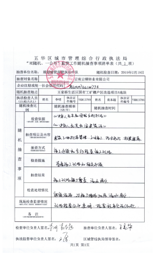 2019年2月19日上午10:00时,五华区城管综执局规划建管中队,在五华区城管综执局执执法监督中队监督员王勇同志的全程监督下,采取“现场实地检查”方式、以“宣教查处并举”措施,依据《中华人民共和国城乡规划法》、《中华人民共和国建筑法》、《中华人民共和国大气污染防治法》及《昆明市建设工程项目施工现场安全监督管理办法》、《昆明市建设工程文明施工管理办法》有关规定,对照《五华区城市管理综合行政执法局“双随机、一公开”监管工作随机抽查事项清单表》对云南云铜锌业有限公司,王家桥生活区国有工矿棚户区改造项目A地块进行检查。