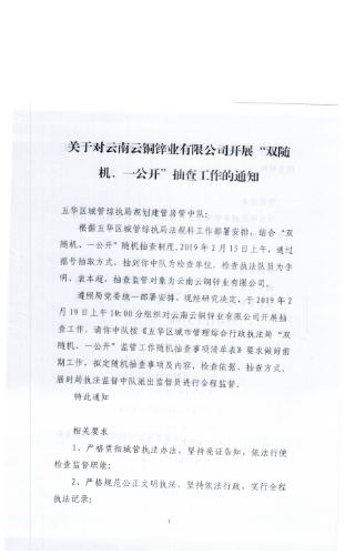 根据昆明市五华区人民政府办公室《关于印发<五华区加快推进双随机一公开监管工作实施方案>的通知》(五政办通〔2016〕59号)文件相关规定,为全面落实“双随机、一公开”抽查机制, 2019年2月15日上午,执法监督中队依照五华区城管综执局部署要求,局法规科通过摇号抽取方式,随机抽取监管对象为云南云铜锌业有限公司。随机选派执法检查人员为五华区城管综执局规划建管中队执法队员袁本超、李明,组织实施检查单位为五华区城管综执局规划建管中队,抽查项目及内容为王家桥生活区国有工矿棚户区改造项目A地块,并于2019年2月18日上午向五华区城管综执局规划建管中队下发了《五华区城市管理综合行政执法局关于对云南云铜锌业有限公司开展“双随机、一公开”抽查工作的通知》和《五华区城市管理综合行政执法局“双随机、一公开”监管工作随机抽查事项清单表》。