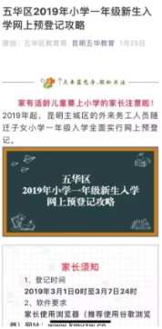 1月25日,五华区教育体育局通过官方微信平台推送了第二条重磅资讯《五华区2019年小学一年级新生入学网络预登记攻略》,对预登记时间、浏览器要求、填写方式等一一进行图文说明,帮助家长一看就懂一学就会。当天区属各小学幼儿园将微信转发至家长群,让家长早知道、早了解、早学会、早安心,微信推送阅读量达3.5万。
