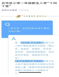 3月29日,五华区教育体育局通过官方微信平台推送了第三条重磅资讯《五华区小学一年级新生入学“十问十答”》,从家长角度看问题,推送内容围绕“什么时间”、“如何看招生地段和服务窗口确认点”,及“什么时间”、“如何领入学通知书”等热点焦点问题进行“一问一答”,形式简洁明了,阅读量达2.1万。