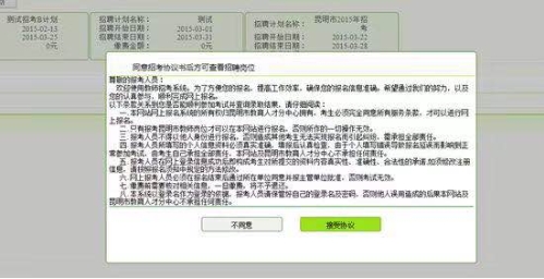 5、点击报名之后,可以查看招考计划的具体信息,如果要查看该招考计划的岗位信息并进行报名,请点击相应的招考计划。此时请认真查看同意招考协议书条款,同意该协议书之后方能查看招考岗位信息。