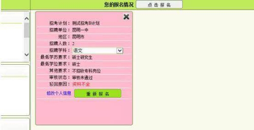 如果审核没有通过,需要查看驳回原因。此时可以根据驳回原因进行修正,并选择该计划下的岗位进行重新报名或者删除该报名岗位,点击“开始报名”,重新报名该计划或者其他计划。