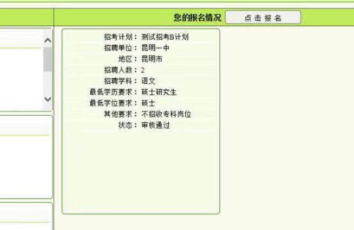 4、完善个人资料后,点开报名通道,可以点开左边的招考公告查看相关的公告信息。如果要确定报名,请点击右边“点击报名”
