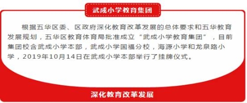 武成小学教育集团是五华教育优质资源不断辐射、不断沉淀的结果。五华教育人敢为人先的精神,走出了武成小学集团化办学的崭新一步。而海源小学和龙泉路小学同属具有百年历史、底蕴深厚的学校,两校校长都是武成小学走出去的名师,奠定了武成小学集团化办学一脉相承的基础。