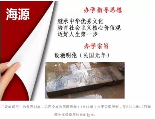 学校紧紧围绕“设教明伦”的办学宗旨,明确“童蒙养正、明智修德”的办学理念,谨记“崇德笃学”的校训,让“教学相长”的校风、“诲人不倦”的教风、“学而不厌”的学风引领海源莘莘学子以实际行动解读“学海思源”的深刻内涵。