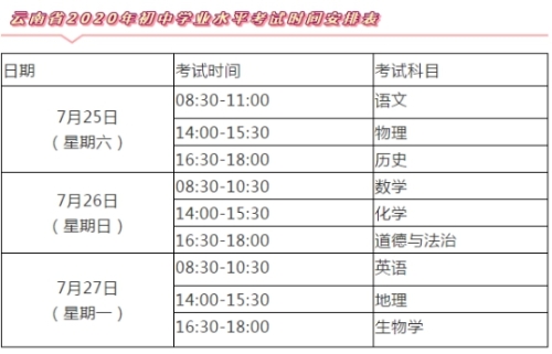 一、2020年云南省初中学业水平考试笔试科目时间由原定6月28-30日延期至7月25-27日。具体科目考试时间安排见《云南省2020年初中学业水平考试时间安排表》。