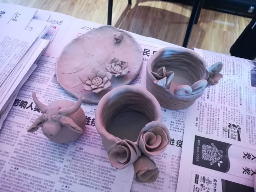 来自昆明活泥巴文化传播有限公司的制陶艺人王老师深入讲解笔筒、茶碗、莲花香坛和陶瓷瓦猫的捏制方法。现场模拟训练、互动指导和案例分析教学形式全面激发了大家的创作热情。软软的陶土在同学们揉、捏、团、搓、堆中,被注入了新的生命力。莲蓬荷叶盘、玫瑰花语杯、莲香塔坛、小牛酒灌等一件件匠心独韵、栩栩如生的作品展现在我们眼前。
