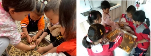 幼儿园以班级为单位开展了丰富多彩的庆丰收活动:小班的宝宝们开展了洗花生、毛豆、剥花生、煮花生等活动;中班组的宝贝们通过亲子在小菜园里采摘玉米、红薯,并动手加工制作成美味的玉米饼、红薯条;大班的宝贝们还把在家里采摘的水果带到幼儿园,做成美味的水果拼盘,在全园进行了分享。