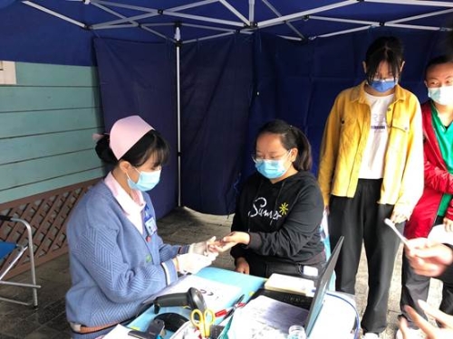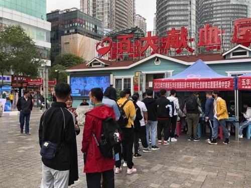 2020年10月10—11日,共青团五华区委、五华悦行青少年事务服务中心联合驻区高校青年志愿者服务团队,在昆明市南屏步行街昆百大献血点开展“五华区团员青年学雷锋无偿献血志愿服务集中活动”,这是共青团五华区委今年第4次组织青年志愿者开展集中献血活动,两天时间共有192名大学生志愿者和辖区青年志愿者参与,138名志愿者成功献血,血量达48300多毫升。同时,志愿者们还在献血点周边开展义务献血宣传,发动市民献出自己的爱心,积极参加义务献血。志愿者刘建红献血后说道:“我健康、我献血、我快乐,献血是一种助人为乐的美德,既可以奉献爱心、帮助他人,还有益健康。”